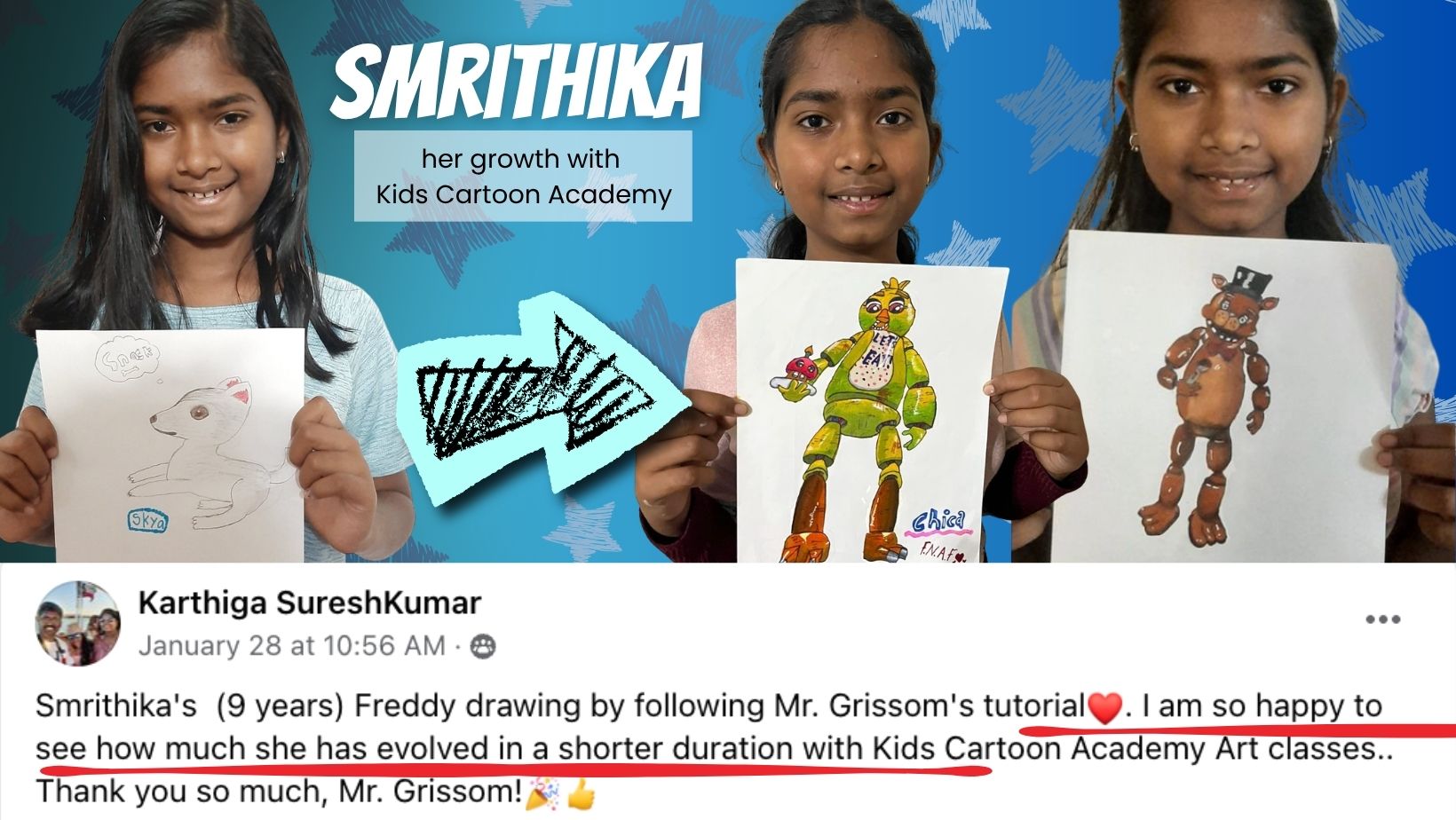 Kids Cartoon Academy is excellent. I see the progress in my daughter—she is amazing with her drawings. The classes and teachers are very professional, and the experience has been incredible for her growth and confidence.